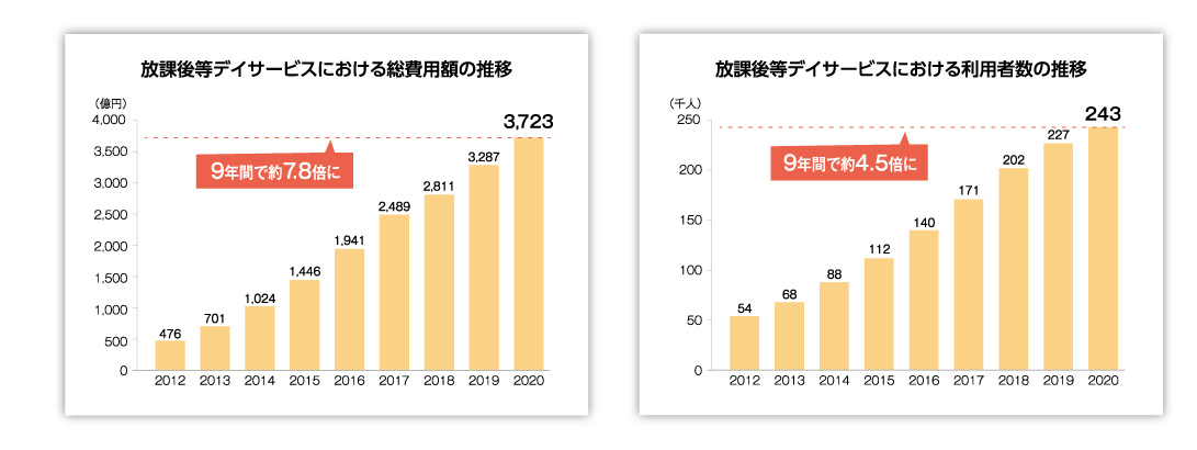 全国的に少子化が進む昨今ですが、福祉を必要とする人の割合は年々増加する傾向にあります。放課後等デイサービスの利用児童数自体も9年間で約4.5倍に増え、利用費用にいたっては8年で約7.8倍に増えています。
