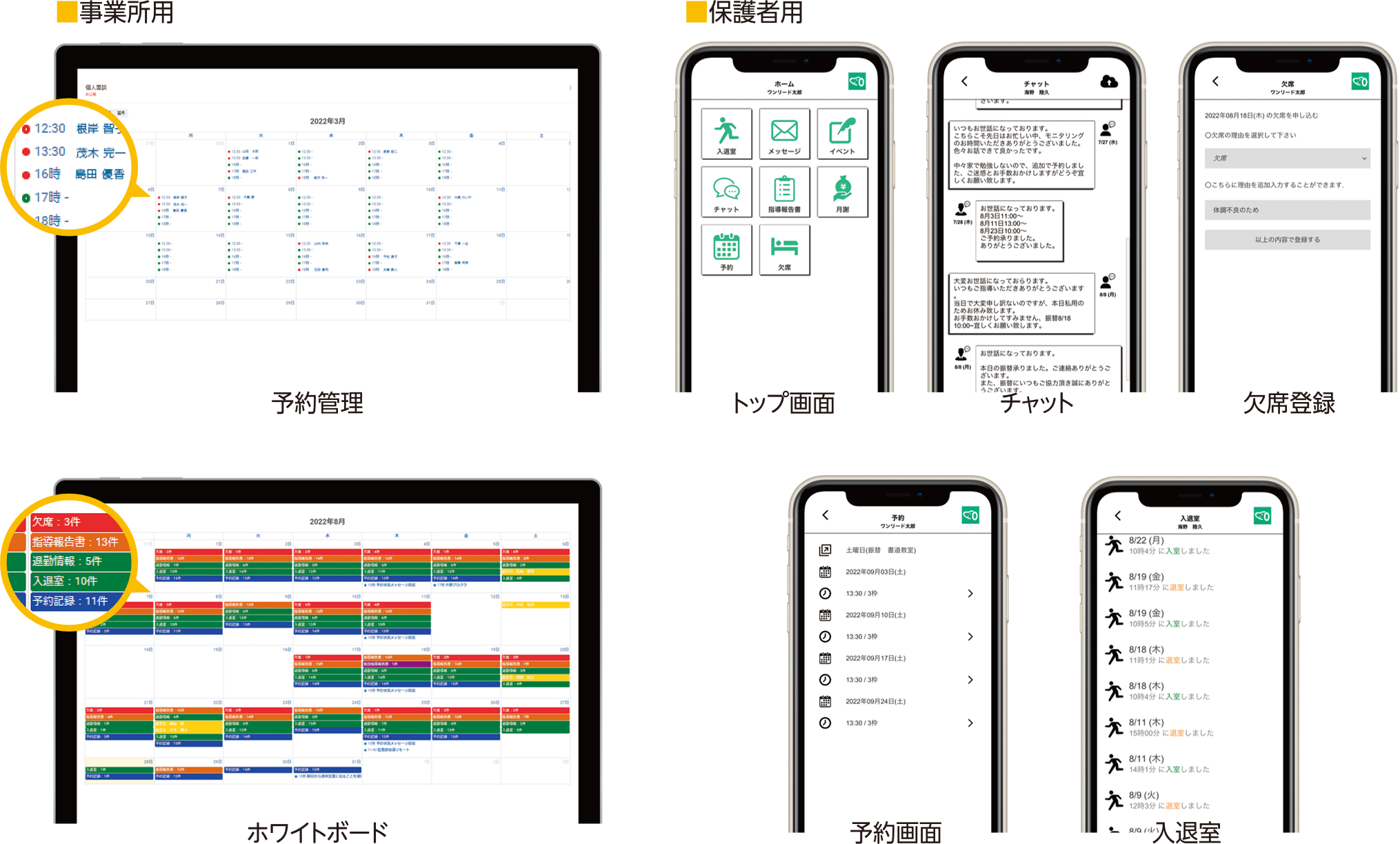 煩雑な書類に多くの時間を費やすより、子どもの支援に時間を使いたい。その想いから自社開発したオリジナルアプリ「ワンリード」です。日々の記録から保護者とのコミュニケーション、国への請求まで、常に現場を考えアップデートを続けています。
